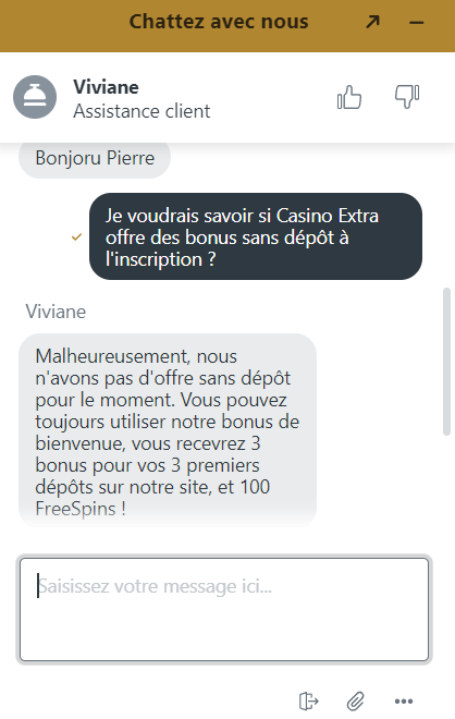 Il n’existe malheureusement pas de bonus sans dépôt à l’inscription sur le site de Casino Extra. Viviane du service client me l’a confirmé via le chat en direct :