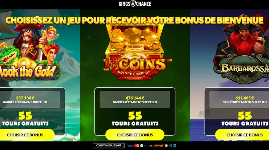 Code promo Kings Chance : recevez 55 tours gratuits sans dépôt à l’inscription sur Hook The Gold, 16 Coins ou Barbarossa — activation automatique via notre lien partenaire !