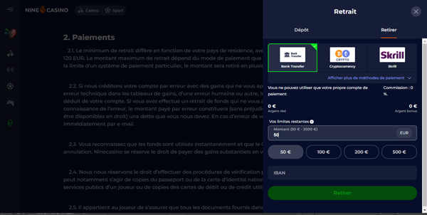 Nine Casino proposait plusieurs méthodes de retrait (cartes bancaires, virements, e-wallets). Le processus typique était le suivant :