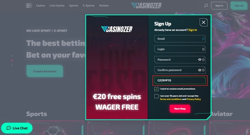 3) Code promo Aviator : Casinozer 100% jusqu’à 1 000 € + 50 tours offerts