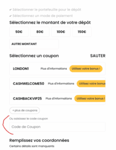 ⚠️ Ne sélectionnez pas un autre bonus dans la liste (WELCOME, VIPBONUS…), sinon le code “10EUR” ne fonctionnera pas.