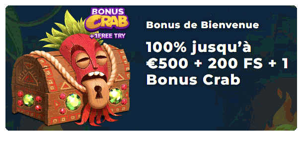 Bonus de bienvenue (EUR) : 100 % jusqu’à 500 € + 200 free spins + 1 bonus Crab