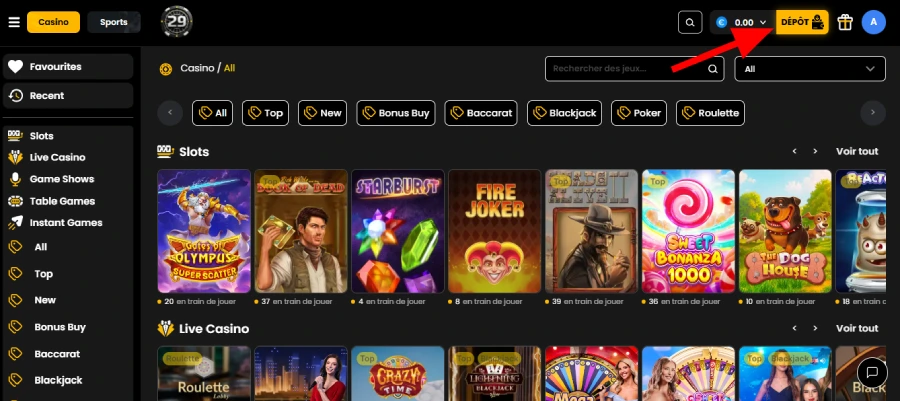 Cliquez sur le bouton jaune en haut à droite de l’écran une fois que vous avez réalisé la connexion casino à 29Black.