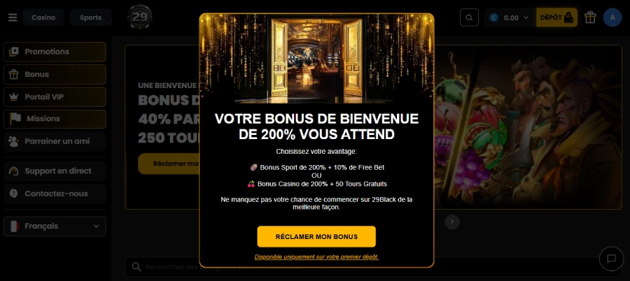 Bonus de bienvenue casino 29Black : 200% jusqu’à 2 000 € + 50 tours gratuits