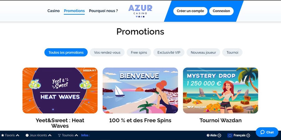 Le système promotionnel d’Azur Casino était dense, avec plusieurs couches de bonus réguliers :