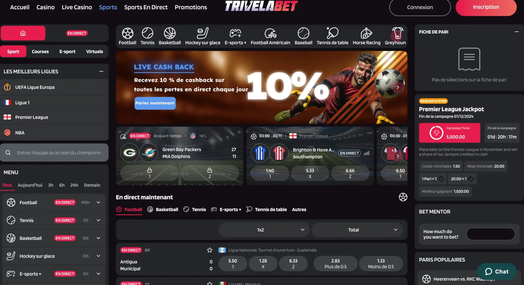 Sur Trivelabet, les options de paris sportifs sont nombreuses et bien structurées. Les joueurs peuvent parier sur 42 disciplines sportives allant du football au basketball, en passant par le tennis, les sports électroniques et même les courses hippiques.