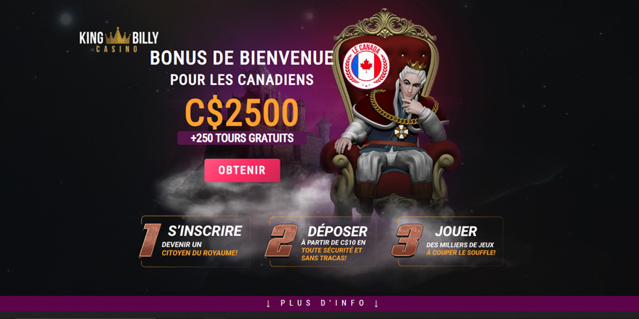 Ensuite, j’aimerais vous présenter King Billy Casino qui est considéré comme un excellent casino en ligne Québec. Il propose une thématique et des graphismes de haute qualité. La plateforme offre un généreux bonus de bienvenue pouvant aller jusqu’à 2 500 € répartis sur les quatre premiers dépôts.