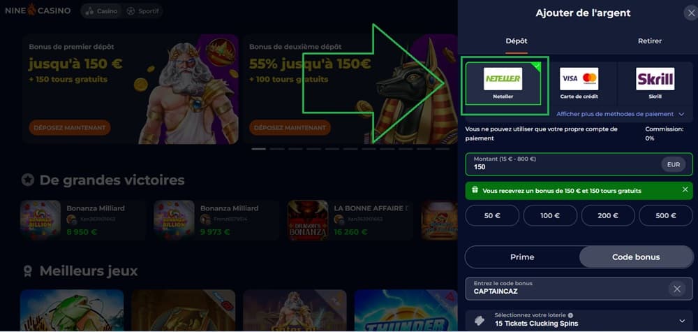 | 💳 Dépôt via Neteller | Min. 10 € • Instantané |